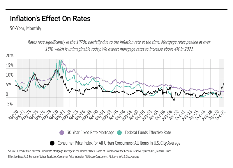 On January 26, 2022, the Federal Reserve (the Fed) indicated that it would raise the federal funds rate as soon as March for the first time in over three years. The Fed adjusts the federal funds rate to influence broader interest rates, which directly affect the borrowing costs of banks. Generally, if bank borrowing costs are low, consumer borrowing costs will be low(er), and vice versa. The Fed uses interest rates in particular as a tool to meet its dual mandate of maximum employment and price stability. Employment and price stability are long-term indicators for home prices. We will start with the good news. Employment rebounded considerably from the highest spike in unemployment in modern history in spring 2020 to pre-pandemic levels by December 2021. As you might imagine, high unemployment rates for extended periods lead to less overall wealth: Fewer people buy homes, and more people experience foreclosures, thereby lowering home prices. Although unemployment seemed dire in 2020, employment is now on solid ground. If we view the current record-high 10.5 million job openings, along with the nearly 10 million new businesses created over the past two years, we get a better understanding of why unemployment dropped so significantly despite a record number of job openings. Simply put, people are working, and that is good for individual wealth and the larger economy. On to the kind-of-good, kind-of-bad news … rising mortgage rates could help curb inflation and create a more balanced housing market (although 2022 will surely be a sellers’ market), but it will make homes more expensive monthly, hitting first-time homebuyers the hardest. With the federal funds rate at 0% and inflation at a near-40-year high, rate hikes are expected to combat inflation. Essentially, when the cost to borrow increases, fewer people want to borrow, leading to less consumer spending (less demand), which lowers prices. We can look to the last inflationary period, the 1970s, as a loose guide. Inflation today is likely to be much more transitory than it was in the 1970s, but we can still expect a rise in mortgage rates like we saw then. Luckily, however, we will certainly not reach the 18+% mortgage rate that we saw in the early 1980s. As it was then, the Fed is obligated to do something now. While we wish that we could always be in periods of high employment, low inflation, and low interest rates, as we experienced for nearly a decade before the pandemic, we must recognize the atypical nature of that period. As we enter this new chapter of rising mortgage rates, we don’t expect home prices to change significantly, if at all, because supply is still such a driving factor. In December 2021, there were 57% fewer homes on the market than in December 2019. The low supply means that demand can decline without affecting prices. Does it matter if 10 offers drop to five? Probably not, and it might even create a better market. Sellers tend to become buyers, so unless you’re a first-time homebuyer, you’ll likely experience both sides of the market. Because sellers are often selling one home and buying another, it’s essential that sellers work with the right agent to ensure the transition goes smoothly. We don’t expect price appreciation to see the record gains we experienced over the past two years, but we do expect home prices to increase. Another factor at play over the past two years was a sharp increase in disposable income, which has now normalized. People had more money to spend over the past two years, and we saw that throughout markets: The housing market, the stock market, cryptos, art, jewelry, etc. all reached record high prices. As disposable income has dropped to a more normal level, we can expect assets to appreciate at a more normal pace. |